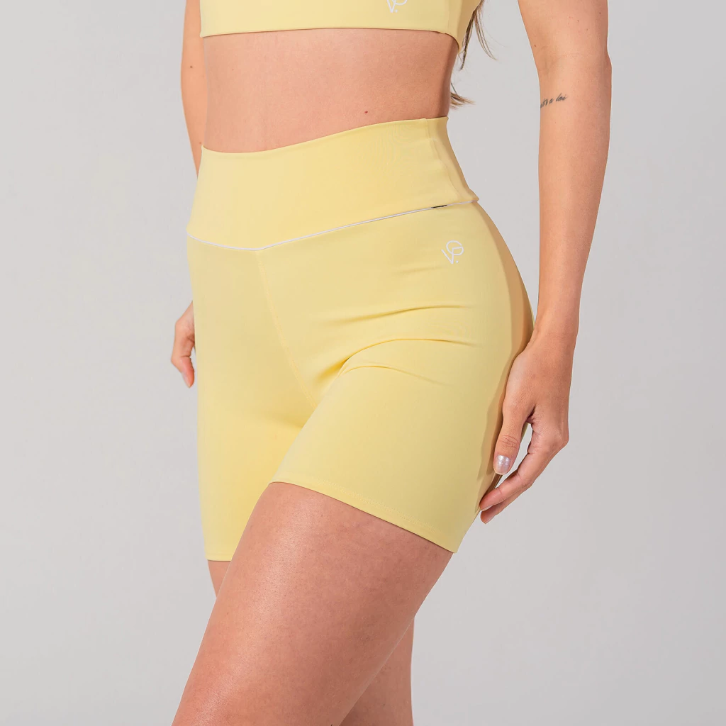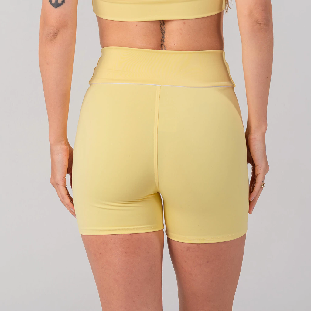 Além disso, o tom amarelo manteiga foi escolhido para transmitir leveza e luminosidade, trazendo um toque sofisticado para o seu look fitness.