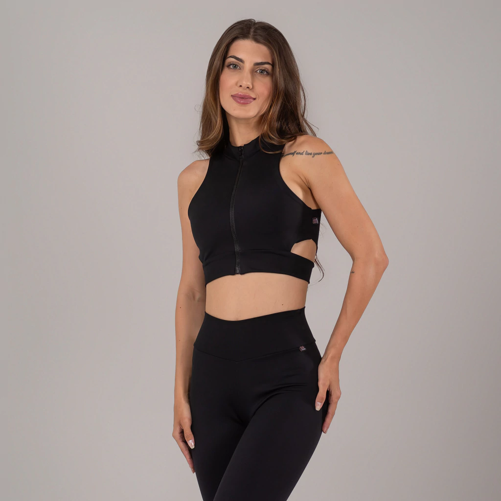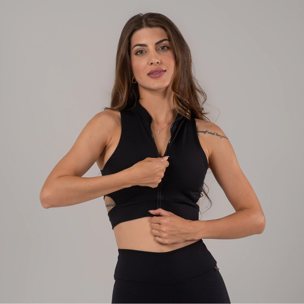 O modelo é sofisticação e modernidade, enquanto a faixa de compressão abaixo do busto oferece suporte adicional, valorizando a silhueta. É um top pensado para mulheres que não abrem mão de estilo, conforto e durabilidade.
